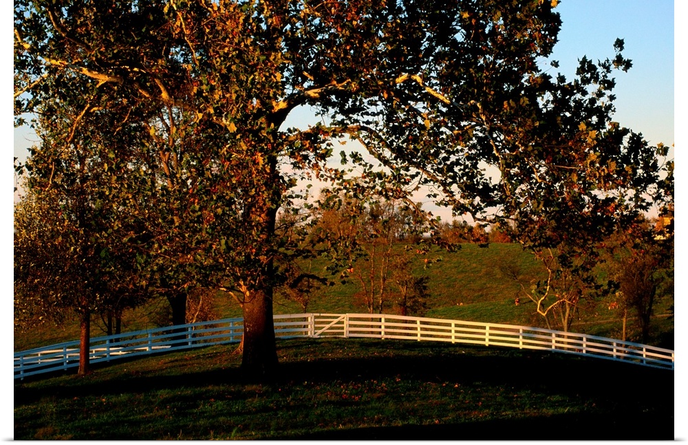 <p>View of a large sycamore tree and white wood fence at the Shaker village at Ple asant Hill.</p>