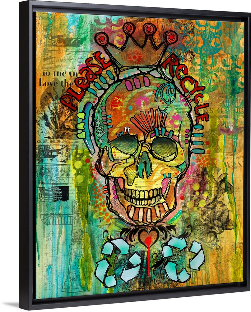 <p>Colorful illustration with a skull wearing a crown and "Please Recycle" written around it on a collage background with newspaper clippings and faint illustrations.</p>