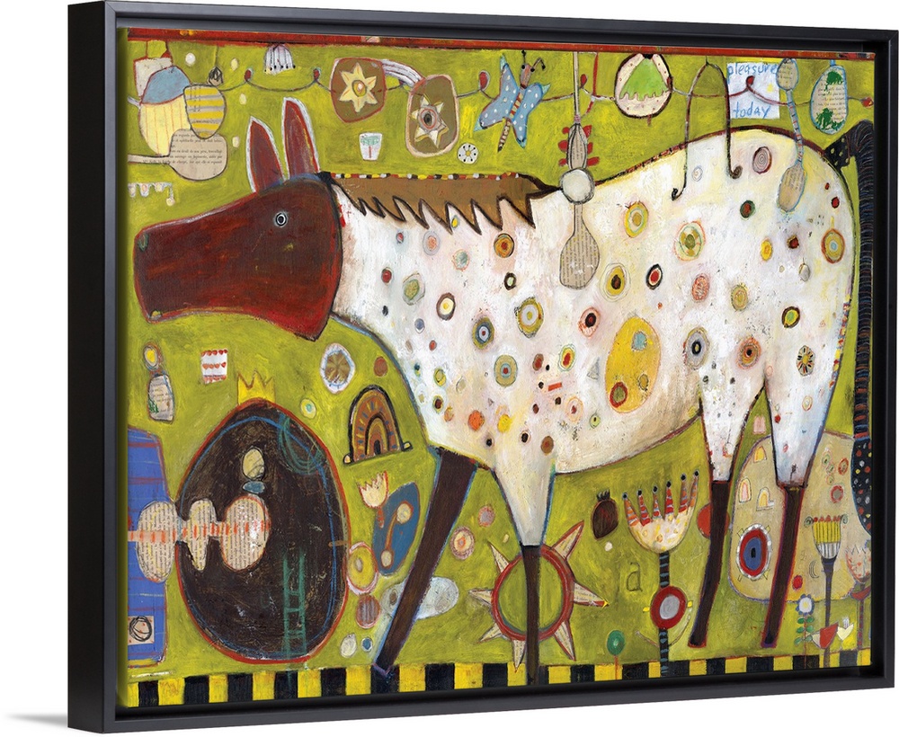 <p>Lighthearted contemporary painting of a horse against a green background.</p>