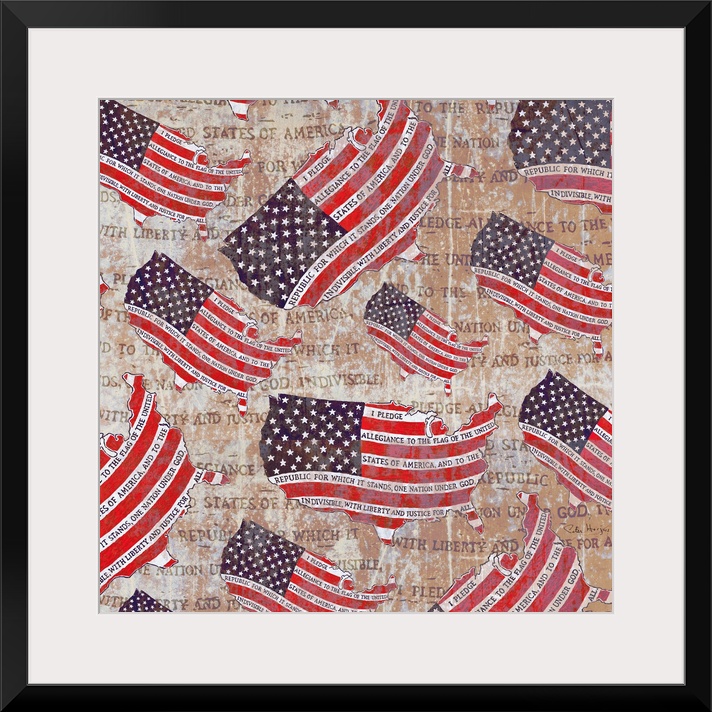 <p>Pen and Ink illustration of the American flag with the words of the Pledge of Allegiance hand-written in the stripes of the flag repeated in a collage.</p>