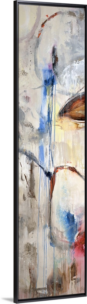 <p>A tall panoramic piece of abstract artwork that uses a neutral background with pops of color that drip down the print.</p>