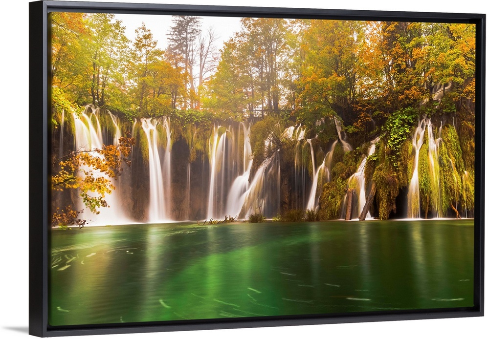 <p>Several waterfalls around a lagoon in Plitvice Lakes, Croatia.</p>