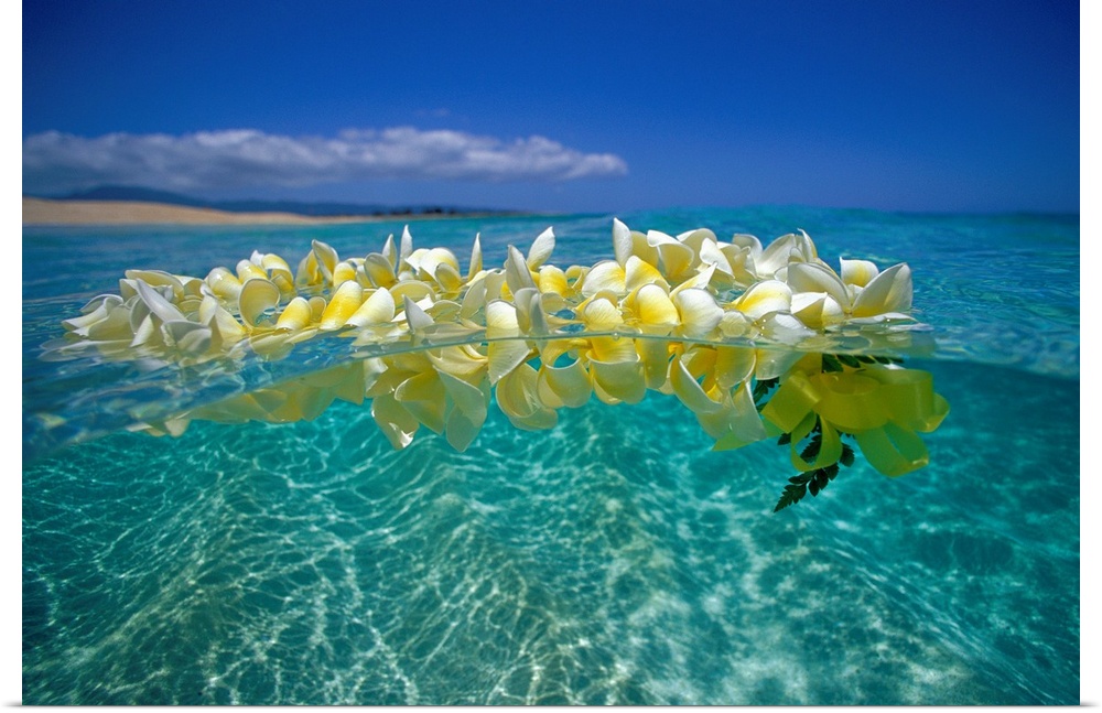 <p>Horizontal photograph on a large wall hanging of a lei of golden plumeria flowers, floating on clear, blue ocean water beneath a bright blue sky.</p>
