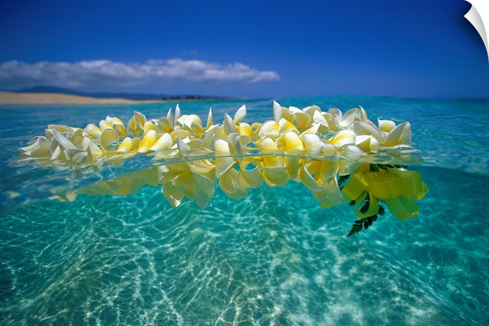<p>Horizontal photograph on a large wall hanging of a lei of golden plumeria flowers, floating on clear, blue ocean water beneath a bright blue sky.</p>