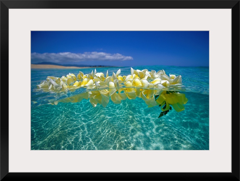 <p>Horizontal photograph on a large wall hanging of a lei of golden plumeria flowers, floating on clear, blue ocean water beneath a bright blue sky.</p>