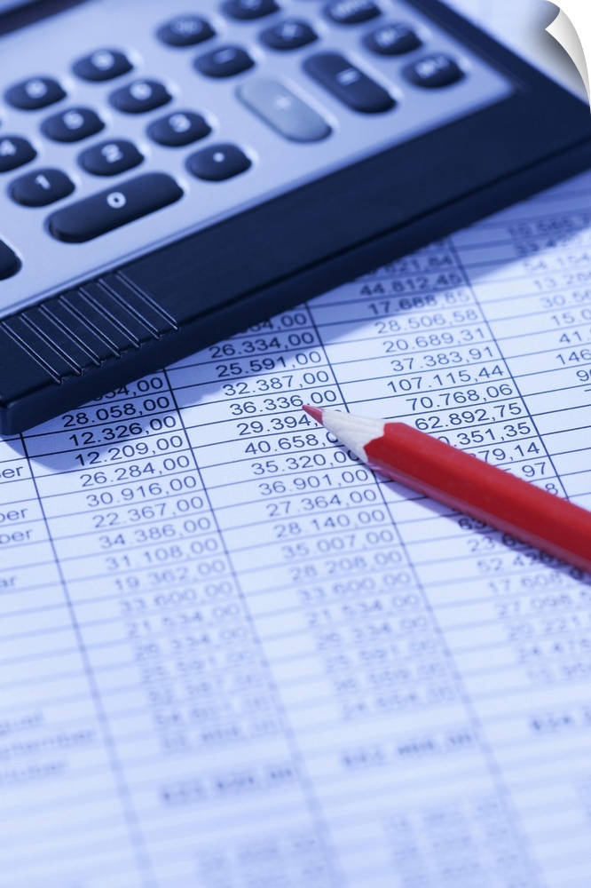 <p>Pocket calculator and red pencil on spreadsheet</p>