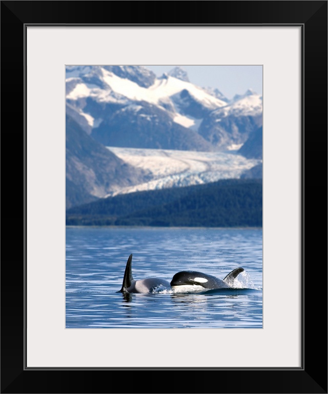 <p>Alaska, Inside passage, two killer whales surface in Favorite Passage near Juneau, Herbert Glacier and Coast Range beyond.</p>