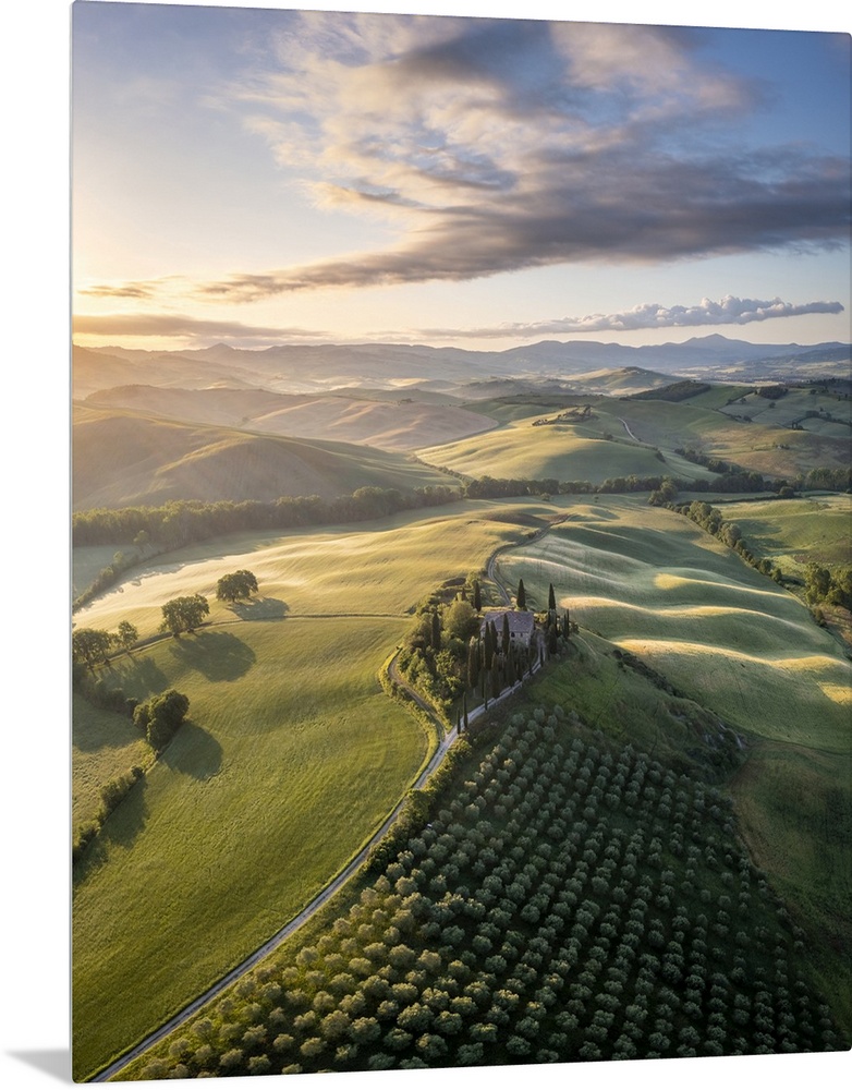 <p>Podere Belvedere and the surrounding countryside at sunrise. San Quirico d'Orcia, Val d'Orcia, Tuscany, Italy.</p>