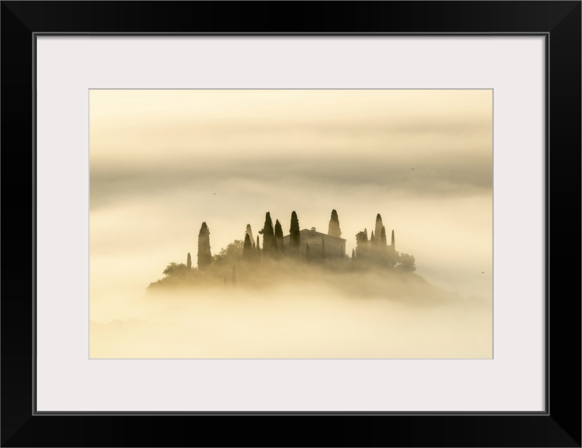 <p>Podere Belvedere shrouded in mist at dawn, Val d'Orcia at dawn, San Quirico d'Orcia, Tuscany, Italy.</p>