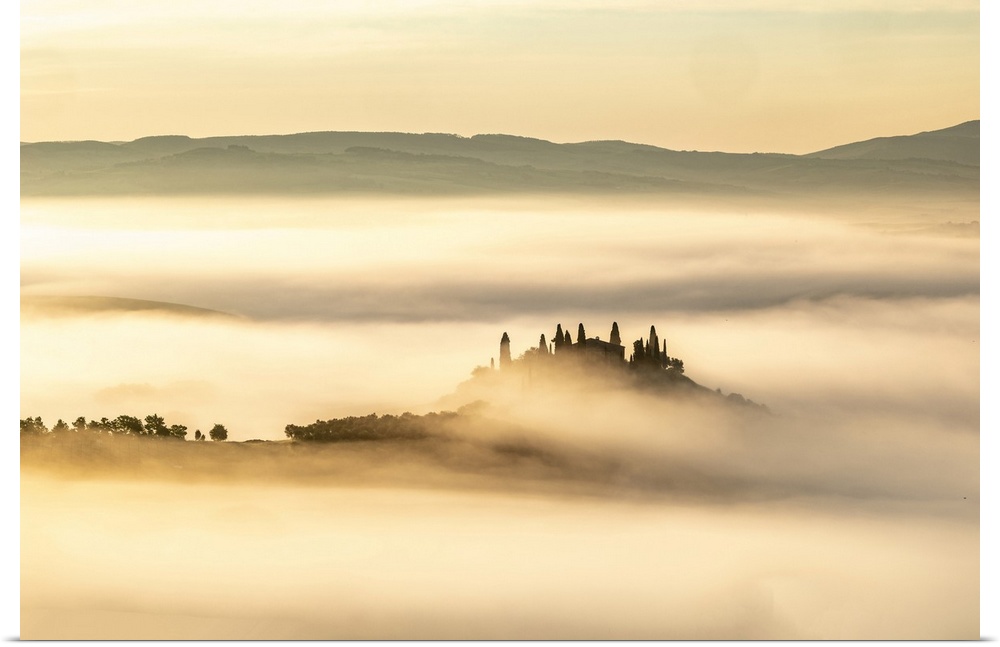 <p>Podere Belvedere shrouded in mist at dawn, Val d'Orcia at dawn, San Quirico d'Orcia, Tuscany, Italy.</p>