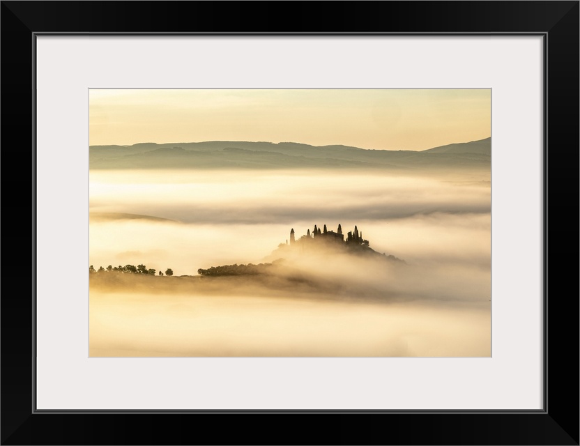<p>Podere Belvedere shrouded in mist at dawn, Val d'Orcia at dawn, San Quirico d'Orcia, Tuscany, Italy.</p>