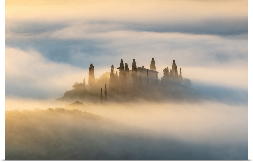 <p>Podere Belvedere shrouded in mist at dawn, Val d'Orcia at dawn, San Quirico d'Orcia, Tuscany, Italy.</p>