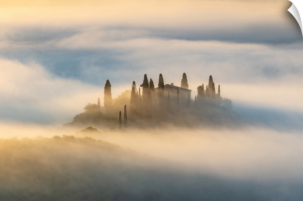 <p>Podere Belvedere shrouded in mist at dawn, Val d'Orcia at dawn, San Quirico d'Orcia, Tuscany, Italy.</p>