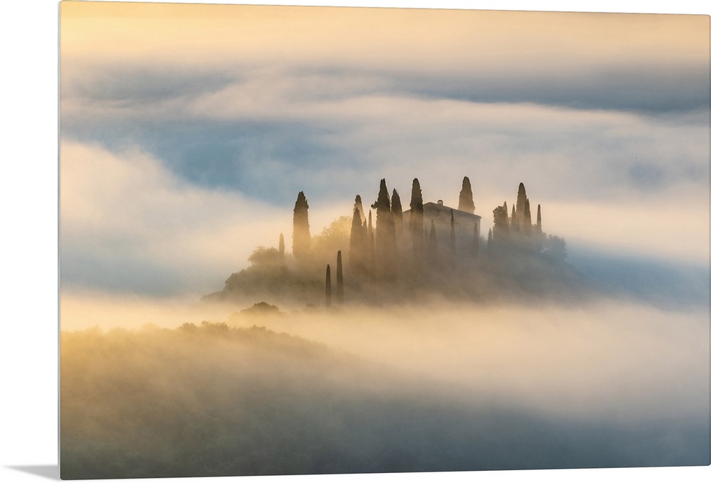 <p>Podere Belvedere shrouded in mist at dawn, Val d'Orcia at dawn, San Quirico d'Orcia, Tuscany, Italy.</p>