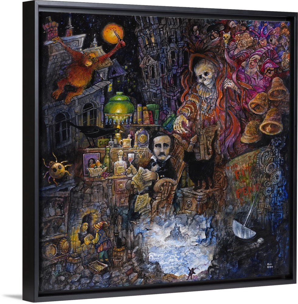 <p>A painting of Edgar Allen Poe surrounded by to images of his literature.</p>