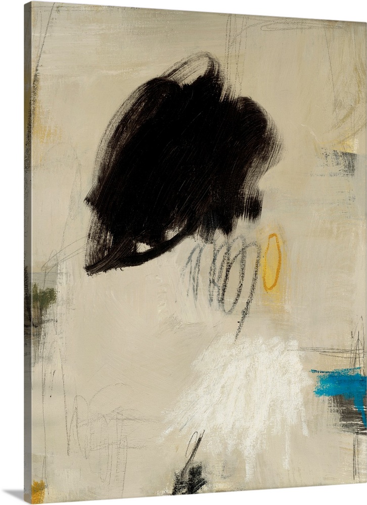 <p>Dynamic abstract art featuring bold black strokes, energetic gray scribbles, and vibrant yellow and blue accents on a neutral cream and white background, offering a modern, sophisticated aesthetic.</p>