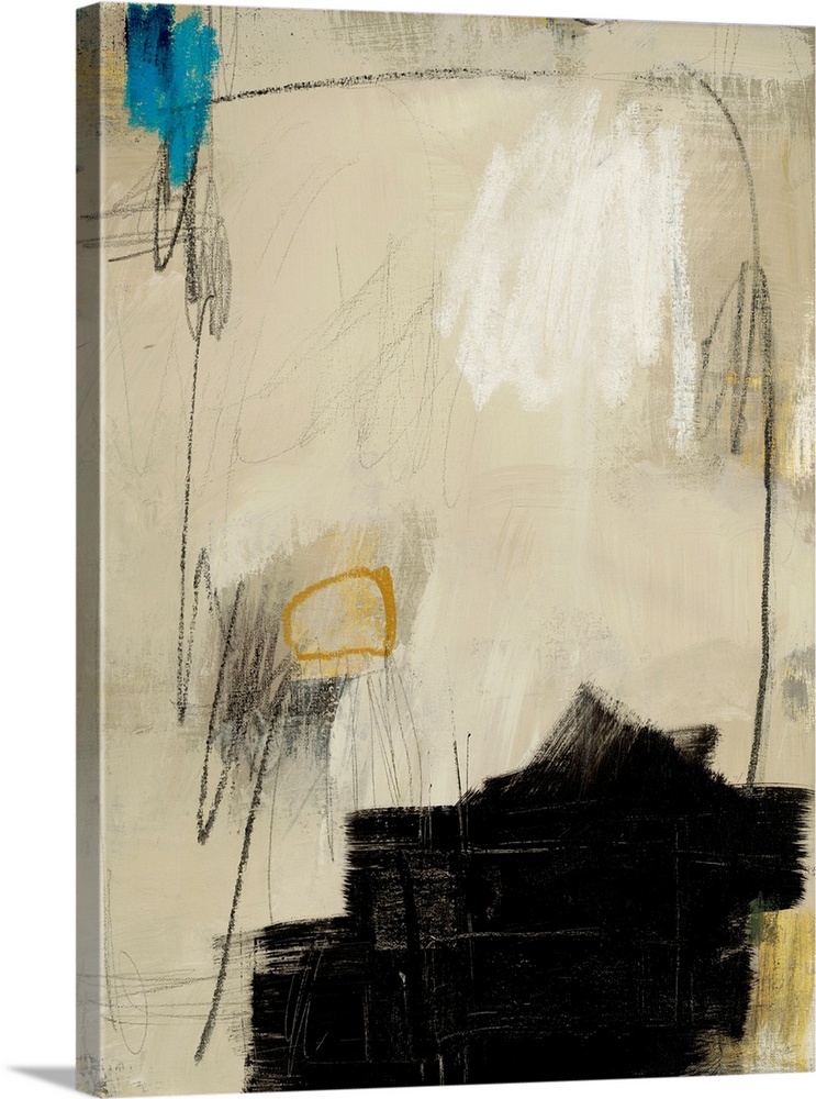 <p>Dynamic abstract art with bold black strokes, a vibrant blue accent, and a yellow ring on a neutral cream background, conveying expressive energy.</p>