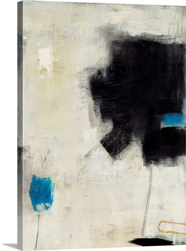 <p>Dynamic abstract painting featuring bold black forms against a textured cream and white background, accented by vibrant electric blue and subtle gold lines. Modern, expressive, and sophisticated.</p>