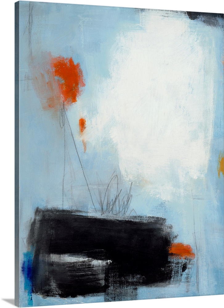 <p>Abstract painting featuring a serene light blue backdrop, bold white and black forms, and vibrant orange accents, punctuated by delicate scribbled lines for a modern, expressive feel.</p>