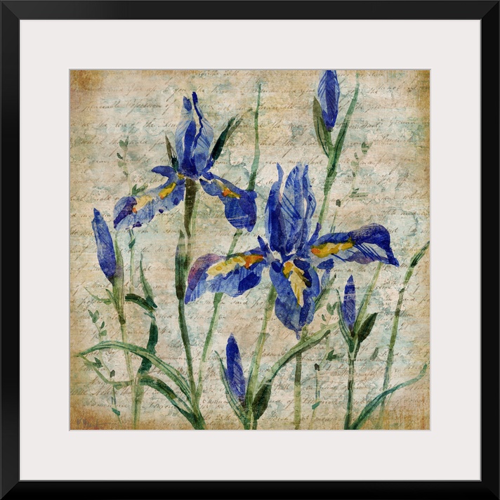 <p>Painting of a group of iris flowers over antique paper with faded handwriting.</p>