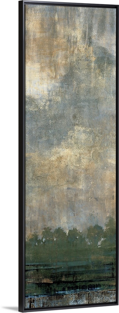 <p>Contemporary painting of a line of trees with green foliage under a cloud filled sky.</p>