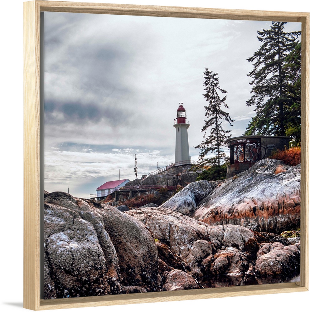 <p>View of Point Atkinson Lighthouse and rocky shore in Vancouver, British Columbia, Canada.</p>