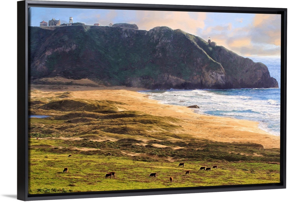 <p>Built in 1889, the Point Sur Lighthouse in Big Sur is built on a rock formation above the Pacific Ocean. It continues to guide ships and steer them clear of the rugged coastline. Below is a secluded beach and field where cows often graze. The artist, Michael Lynberg, draws you in and makes you want to explore this unique and stunning part of the world.</p>