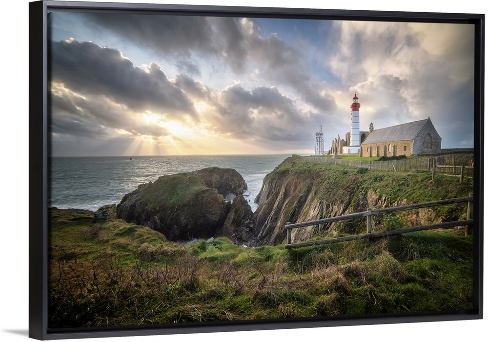 <p>Landscape view of Brittany shoreline called pointe saint mathieu at sunset with rays of light in the clouds. The most famous land lighthouse situated in Finistere area.</p>
