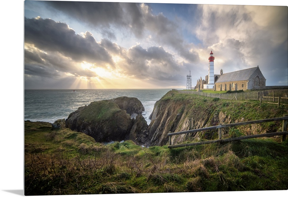 <p>Landscape view of Brittany shoreline called pointe saint mathieu at sunset with rays of light in the clouds. The most famous land lighthouse situated in Finistere area.</p>