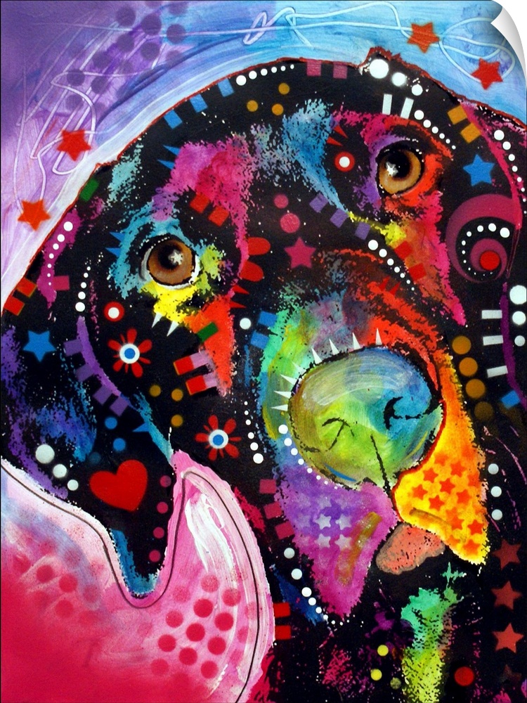 <p>Contemporary stencil painting of a dog filled with various colors and patterns.</p>