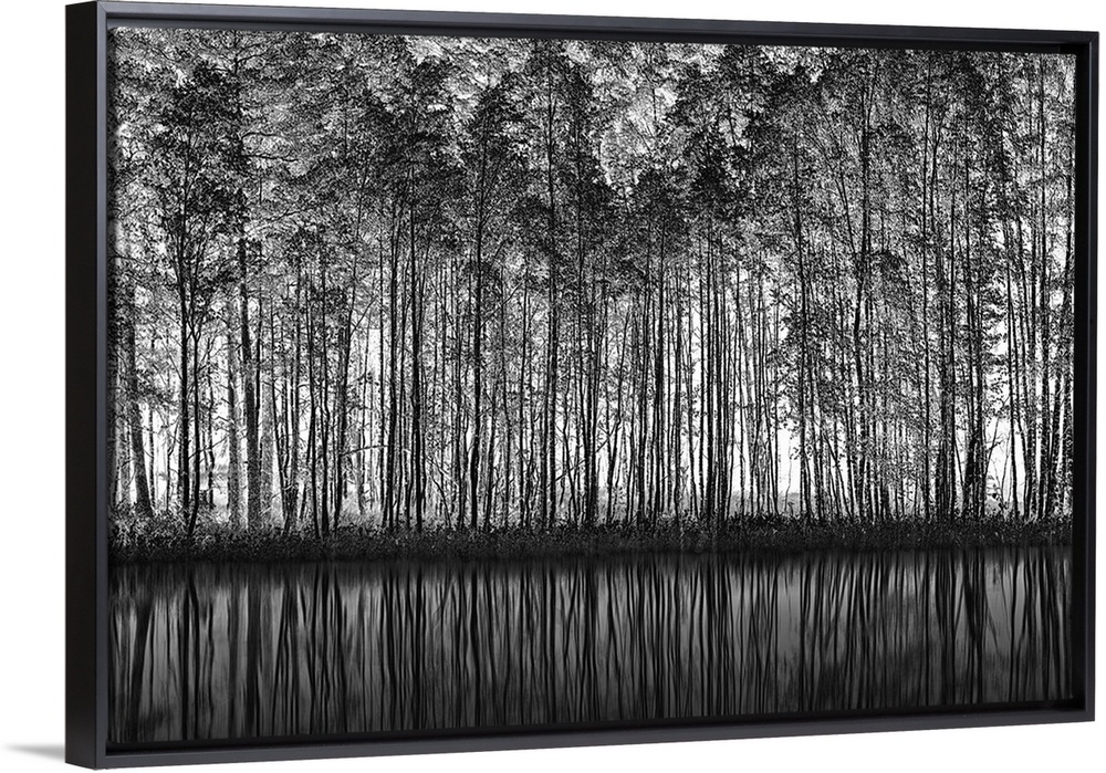 <p>A row of slender trees along a pond, reflected in the water.</p>