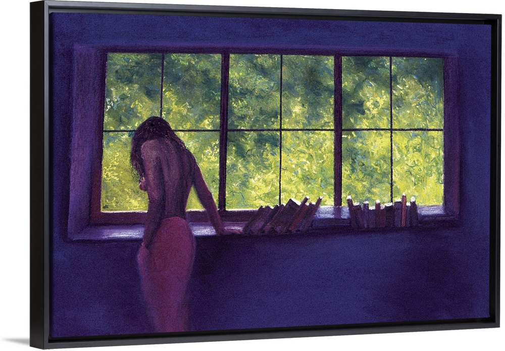 <p>Contemporary artwork of a woman that you can only see the side and back of as she leans against a wide window with books sitting on the sill.</p>