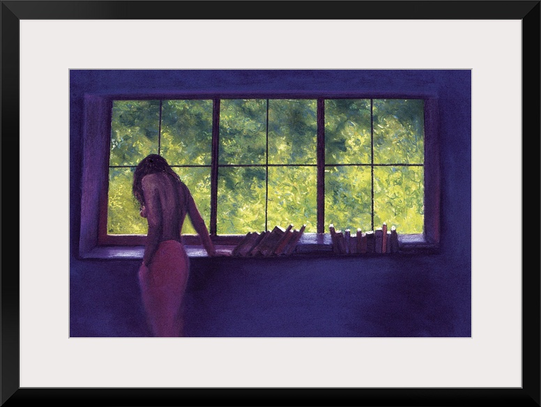 <p>Contemporary artwork of a woman that you can only see the side and back of as she leans against a wide window with books sitting on the sill.</p>