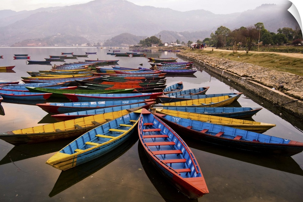 <p>Long tail boats in star formations in a misty harbor in Nepal.</p>