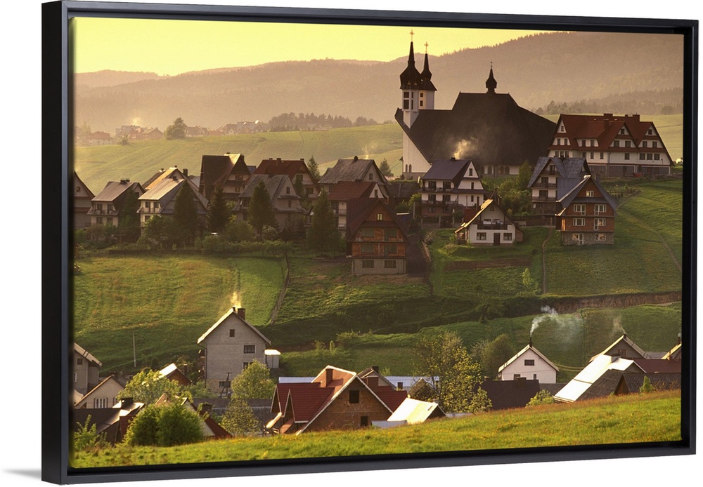<p>Poland, Carpathian Mountains., Kluszkowce. Sunset, Town and new church</p>