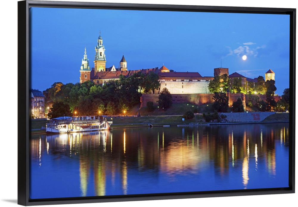 <p>Europe, Poland, Malopolska, Krakow, full moon over Wawel Hill Castle and Cathedral, Vistula River, UNESCO site.</p>
