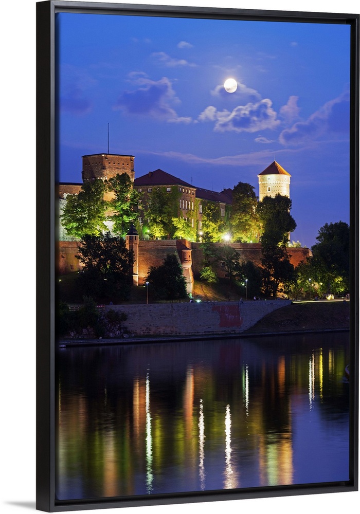 <p>Europe, Poland, Malopolska, Krakow, full moon over Wawel Hill Castle and Cathedral, Vistula River, UNESCO site.</p>
