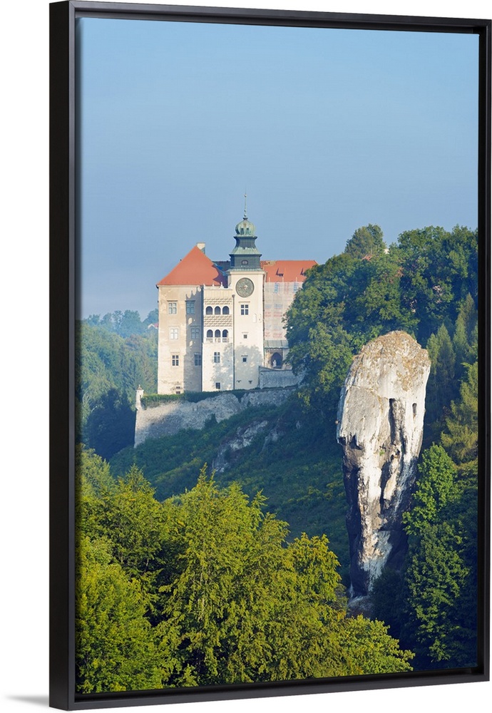<p>Europe, Poland, Malopolska, Ojcow National Park, Pieskowa Skala Castle and Hercules Club, Maczuga Herkulesa, limestone pillar.</p>