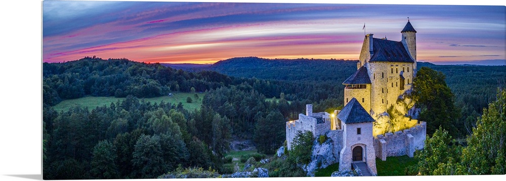 <p>Poland, Silesia, Bobolice, Trail of the Eagle's Nests, Colorful clouds after the sunset on Medieval Bobolice castle at dusk.</p>