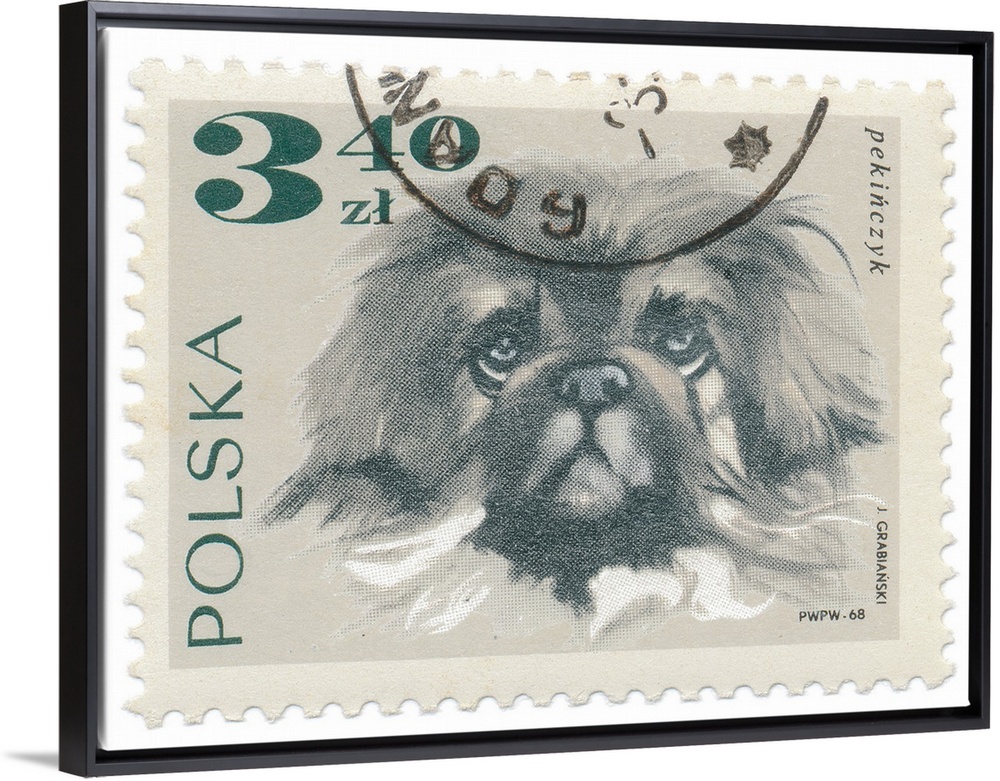 <p>Artwork of a Polish postage stamp of a pekingese with a black postmark overlapping.</p>