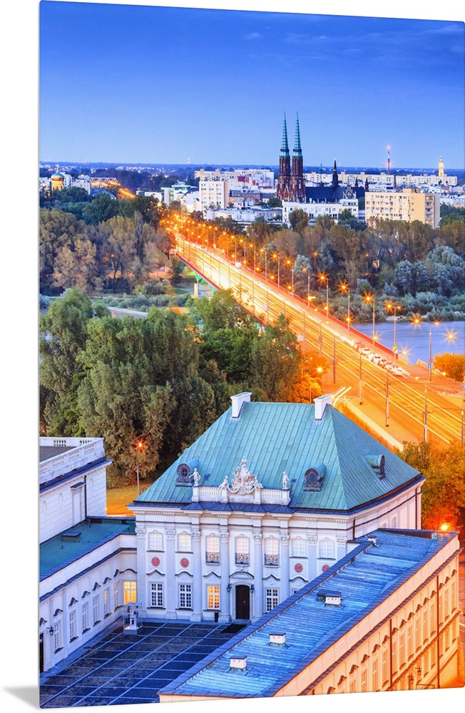 <p>Poland, Masovia, Warsaw, Warsaw Royal Palace, Royal Palace with Saint Florian's and Saint Michael's Cathedral in the background at night.</p>