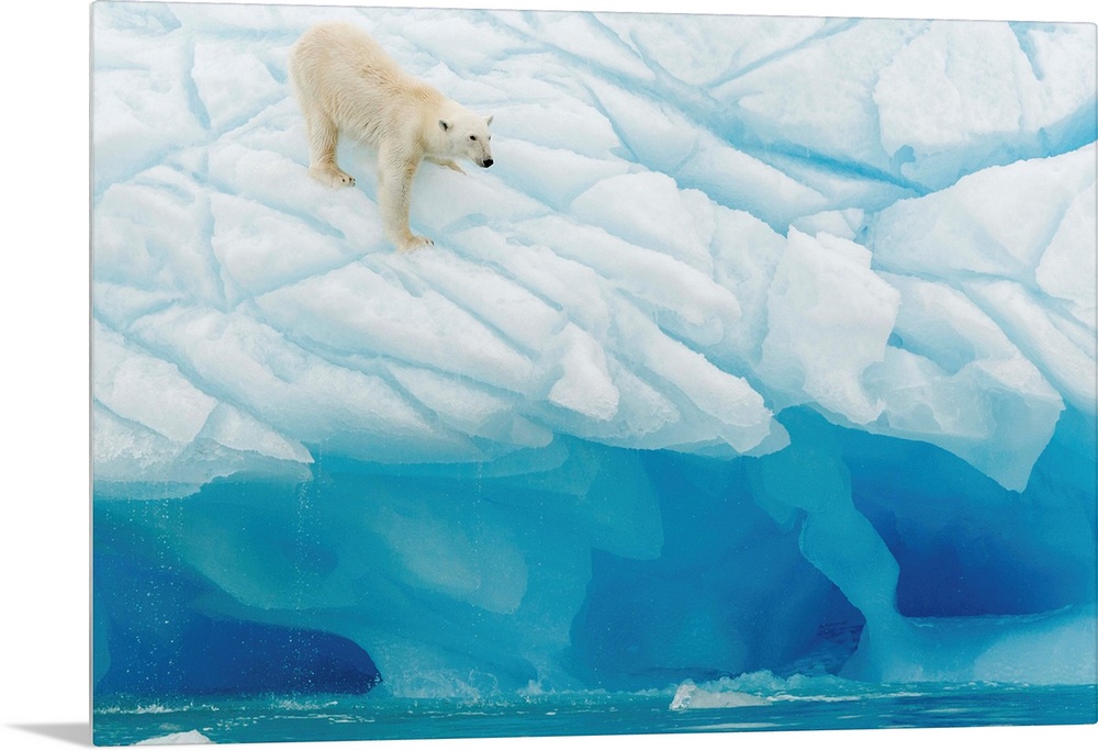 <p>A polar bear on the edge of a glacier.</p>