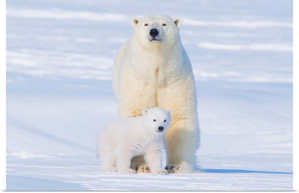 <p>USA, Alaska, North Slope, 1002 area of the Arctic National Wildlife Refuge. Polar bear, Ursus maritimus, sow with spring cub, newly emerged from their den in early spring, get acclimated to the outdoors before they head out onto the sea ice to hunt seals.</p>