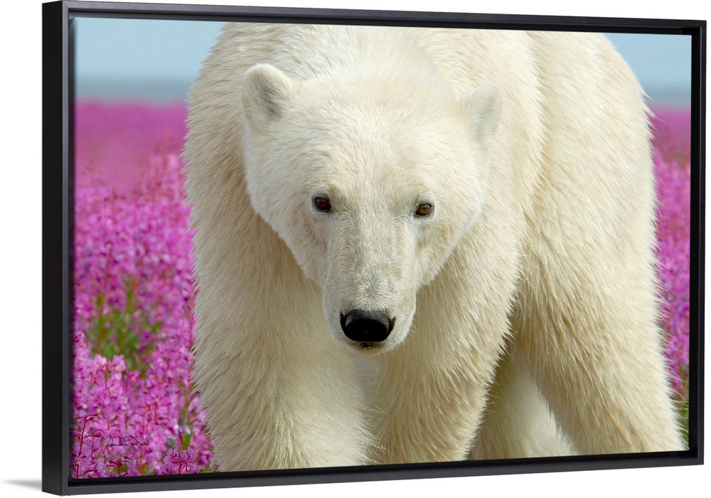 <p>Polar Bear in fireweed on an island off the sub-Arctic coast of Hudson Bay, Churchill, Manitoba, Canada stares intently at the photographer.</p>