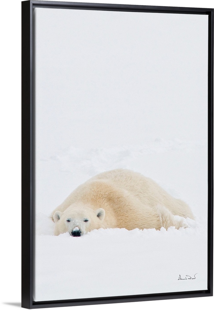 <p>Polar bear on Hudson Bay coast in Manitoba, Canada, stretching out and getting comfortable in the fresh snow after heating up from a wrestling match.</p>