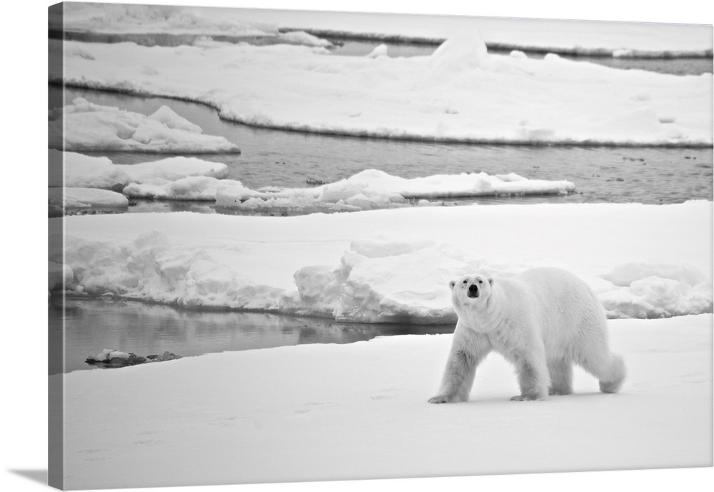 <p>Polar bear (ursus maritimus) crossing ice in arctic, Svalbard, Svalbard and Jan Mayen, northern Norway.</p>