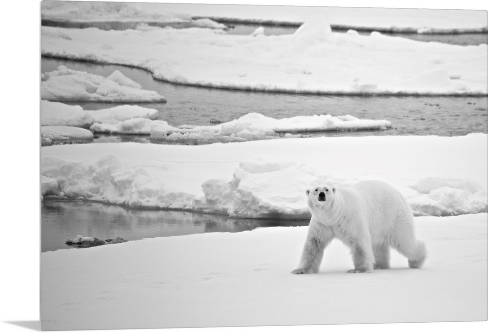 <p>Polar bear (ursus maritimus) crossing ice in arctic, Svalbard, Svalbard and Jan Mayen, northern Norway.</p>