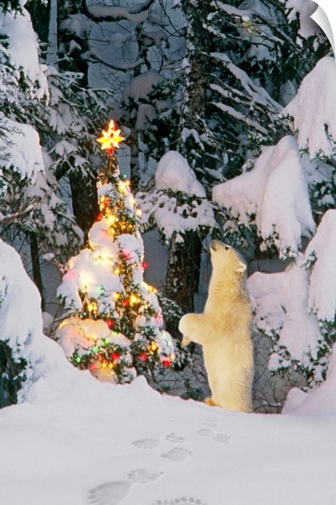 <p>This vertical nature photograph is a nature composite of a young animal investigating a decorated tree in a snow covered forest.</p>