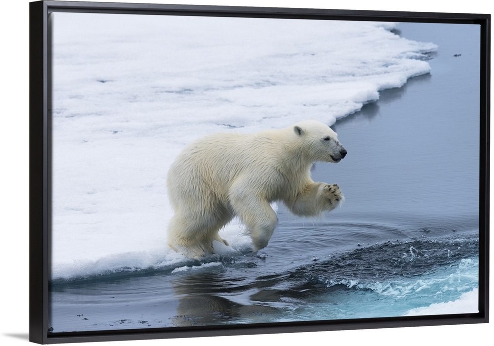 <p>Polar bear cub (Ursus maritimus) jumping over the water, Spitsbergen Island, Svalbard archipelago, Arctic, Norway, Scandinavia, Europe</p>