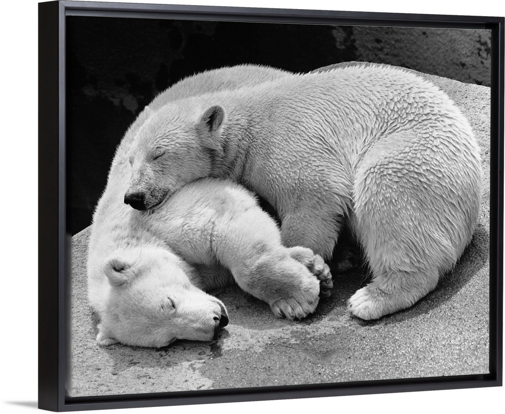 <p>Two Russian polar bear cubs named Amos and Mosa lie curled up alseep together in theit enclosure at London Zoo. England, 1966.</p>